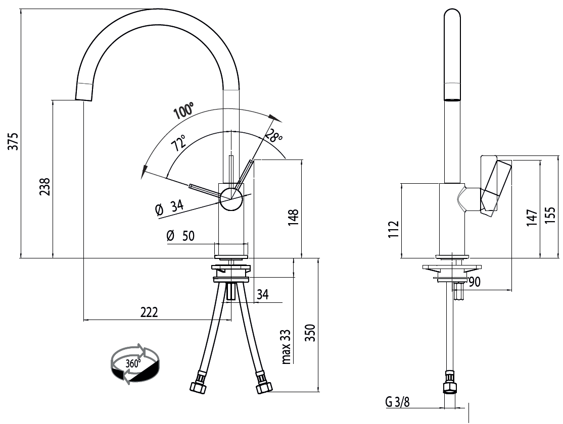 Mitigeur monocommande. Cartouche céramique. Limiteur dynamique de débit ECO-CLIC. Bec pivotant. Finitions: Chrome. Hauteur: 375mm.