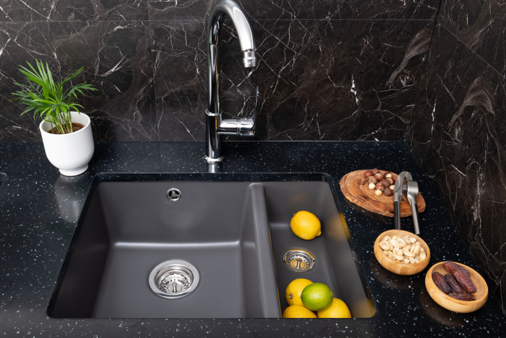 1 cuve en céramique. Fourni avec siphon gain de place, trop plein et crépine automatique chromée. Type d'installation : à sous-encastrer.