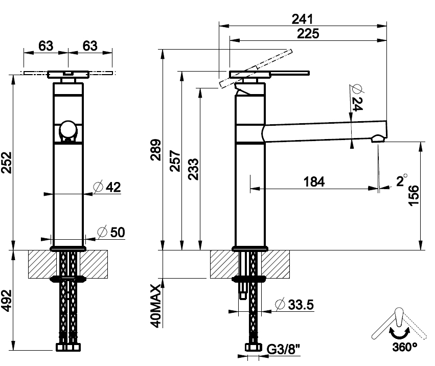 Mitigeur monocommande. Rotatif sur 360°. Cartouche céramique. Hauteur: 252mm.
