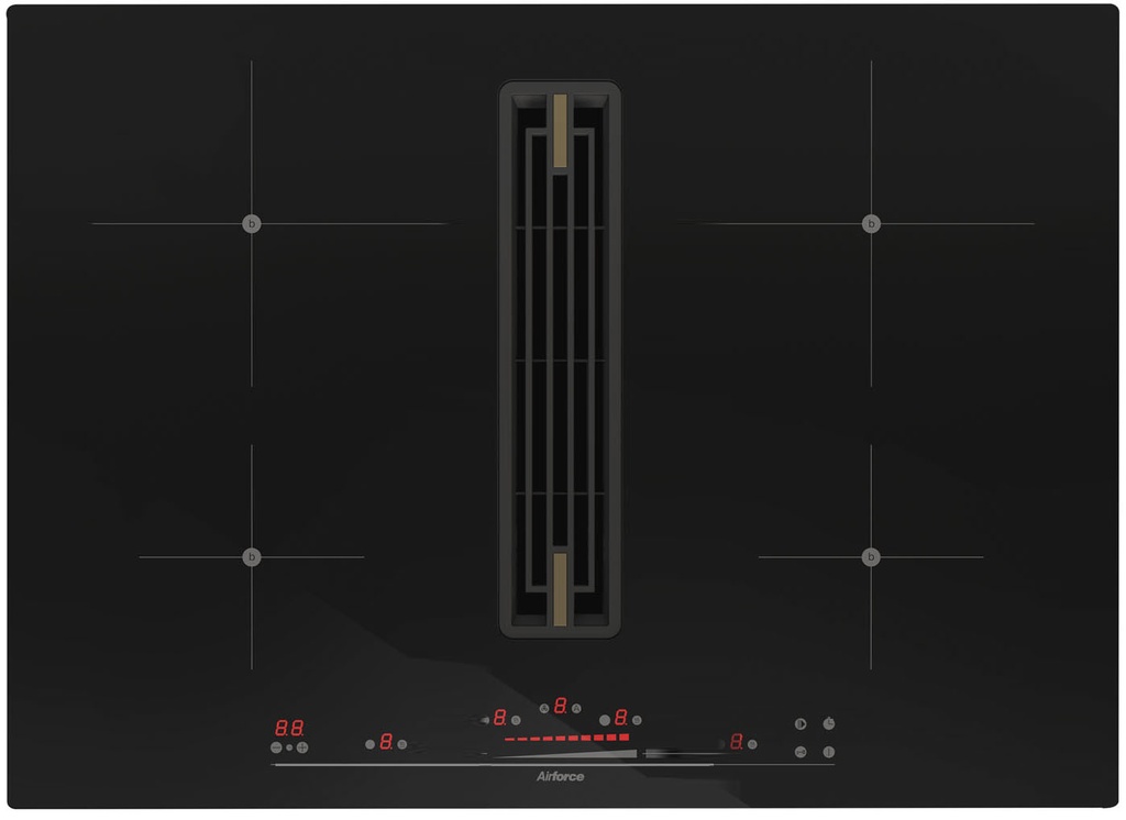 • Table à induction intégrant une hotte aspirante à évacuation ou à recyclage sur la partie centrale, assurant un résultat d'aspiration exceptionnel. Facilité d'installation exclusive liée à l'intégration des deux produits, ainsi qu'une esthétique épurée. Possibilité d’implantation murale, en îlot ou même face à une fenêtre! • Débit d’aspiration : 600 m3/h. • Niveau sonore : 39/64/70 dB(A) • Zones de cuisson : - 2 x Ø145 mm/1,2 kW (Booster 1,6 kW) - 2 x Ø210 mm/1,5 kW (Booster 2 kW) • Puissance max : 7,4 KW • Dimensions : 83×52 cm. • Finition : Verre noir. • Commandes touch slider, 4 zone de cuisson 9P+booster, aspiration à 5 vitesses (4+1 intensive). • Dimensions sortie d’air : 222×89 mm.