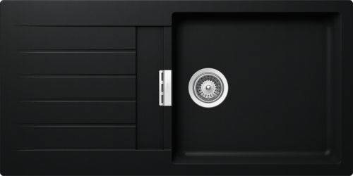 Evier 1 grande cuve + égouttoir en CRISTADUR: Velours satiné, Look pierre naturelle (80% de Quartz), Résitant aux griffes, Thermo-résistant à 180°, Résistant aux chocs. Fourni avec siphon, trop plein et crépines design. Réversible. Taille du sous-meuble: 60 cm Découpe à encastrer: 980 x 480 mm * Découpe à sous-encastrer: 986 x 486 mm